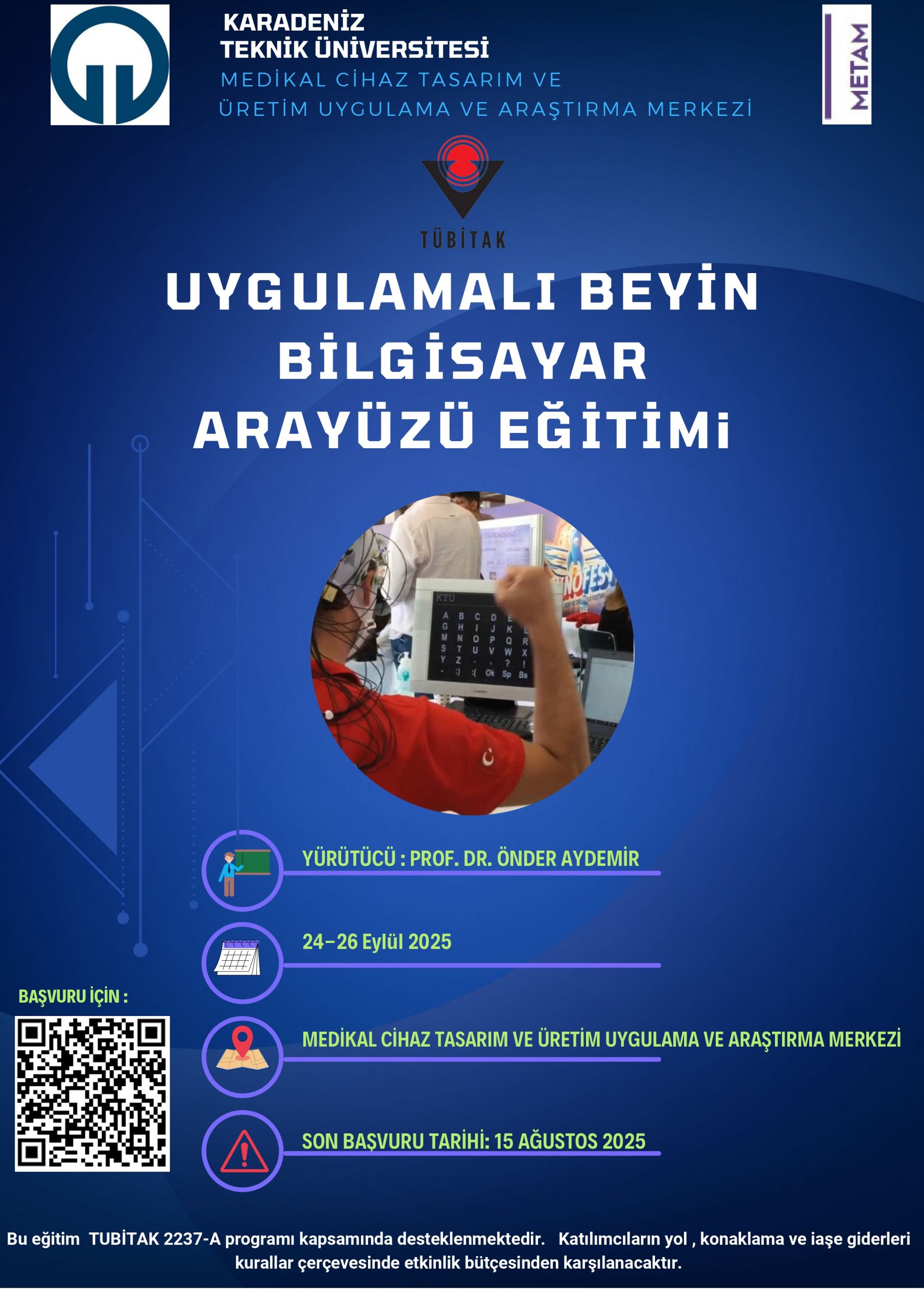 24-26 Eylül 2025 tarihleri arasında Karadeniz Teknik Üniversitesi Mühendislik Fakültesi Elektrik ve Elektronik Mühendisliği Bölümü öğretim üyelerinden Prof. Dr. Önder AYDEMİR’in koordinatörlüğünde, TÜBİTAK 2237-A Bilimsel Eğitim Etkinlikleri Desteği Programı kapsamında “Uygulamalı Beyin Bilgisayar Arayüzü Eğitimi” düzenlenecektir.