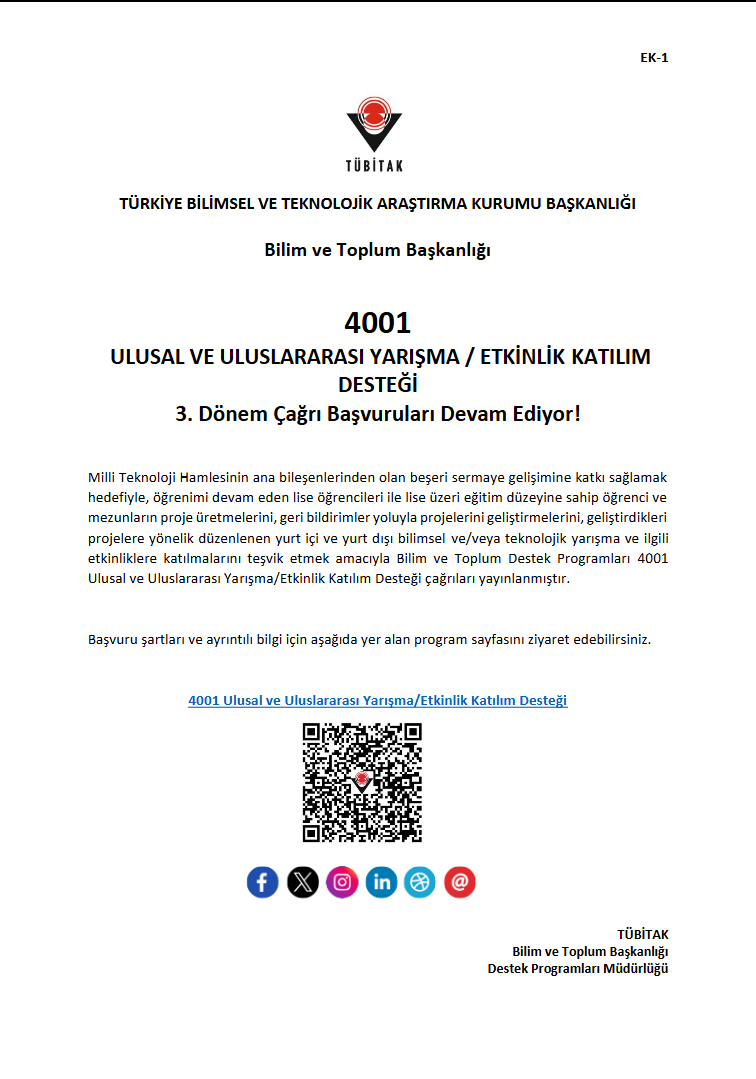 Türkiye Bilimsel ve Teknolojik Araştırma Kurumu Başkanlığı tarafından açılan “4001-Ulusal ve Uluslararası Yarışma/Etkinlik Katılım Desteği”nin 3. çağrı dönemi hakkında Ankara Üniversitesi Rektörlüğünden alınan yazı ve ekleri ilgide gönderilmiştir.
